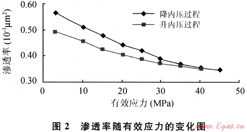 致密低滲透氣藏普遍具有低孔、低滲、束縛水飽和度高的特點(diǎn),由于細(xì)小孔隙喉道處水化膜的封堵作用,氣體滲流往往具有啟動(dòng)壓力梯度特征,作用于氣體兩端的壓力梯度要大于啟動(dòng)壓力梯度才能流動(dòng)[1];同時(shí)許多致密低滲透氣藏具有“應(yīng)力敏感”特征[2]。致密低滲透儲(chǔ)層巖心氣體低速滲流實(shí)驗(yàn)結(jié)果如圖1,在氣體流速和壓力平方梯度的關(guān)系圖上,線性段為達(dá)西滲流段,非線性段不通過坐標(biāo)原點(diǎn),和x軸的交點(diǎn)即為啟動(dòng)壓力梯度,儲(chǔ)層含水飽和度越高,啟動(dòng)壓力梯度作用才明顯。致密低滲透氣藏儲(chǔ)層滲透率隨有效應(yīng)力的變化如圖2??梢钥闯鲈诮祪?nèi)壓過程中,滲透率隨有效應(yīng)力的增大而減小,在儲(chǔ)層壓力恢復(fù)的過程,由于儲(chǔ)層發(fā)生了部分塑性變形,滲透率并不能恢復(fù)到初值。