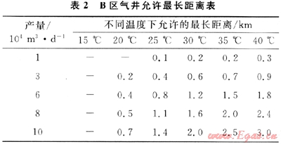 2) B區(qū)氣井的天然氣不伴熱直接進(jìn)站,需要加熱才能脫水,可以取消采氣管道伴熱。不同產(chǎn)氣量和井口溫度,允許采氣管道距離不同,其允許最長距離見表2。