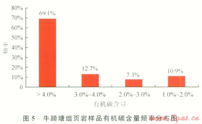 牛蹄塘組干酪根有機(jī)顯微組分以腐泥無定型和腐殖無定型為主,前者相對(duì)豐度為11%~92%,平均為49%;后者相對(duì)豐度為8%~85%,平均為48%。干酪根類型指數(shù)為51~96,干酪根類型以腐泥型和偏腐泥混合型為主。綜合分析認(rèn)為:貴州省牛蹄塘組含氣頁巖的母源主要為藻類等低等水生生物,生烴能力較強(qiáng)。通過對(duì)牛蹄塘組地表露頭和鉆孔巖心樣品的有機(jī)碳含量測(cè)試,發(fā)現(xiàn)頁巖有機(jī)碳含量范圍為0.7%~14.6%,平均為5.2%,主頻在大于4.0%的區(qū)間(圖5)。