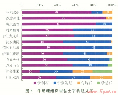 該區(qū)牛蹄塘組頁巖石英、長石等碎屑礦物含量為24%~88%,平均為72.3%;自生脆性礦物含量為0~62%,平均為8.6%;黏土礦物含量介于l2%~30%,平均為19.0%。黏土礦物以伊利石和伊蒙混層為主,綠泥石較少見(圖6)。巖石礦物學(xué)特征表明:頁巖儲(chǔ)層脆性礦物總體含量高,具有較好的破裂潛力,預(yù)測(cè)開發(fā)過程中可取得較好的儲(chǔ)層改造效果[12]。