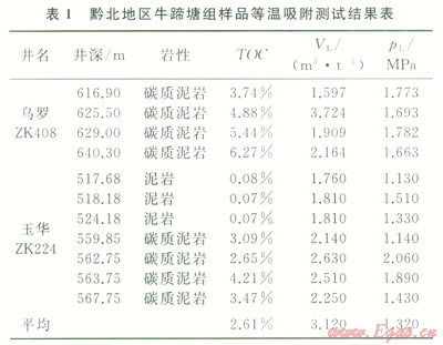 從表l可見,3件樣品有機(jī)碳含量小于1.5%,平均蘭氏體積(VL)為1.79m3/t,平均蘭氏壓力(pL)為1.32MPa;10件樣品有機(jī)碳含量大于1.5%,平均VL為3.12m3/t,平均pL為l.34MPa。綜合上述測(cè)試結(jié)果,牛蹄塘組頁巖模擬最大吸附能力平均為3.12m3/t。