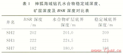 同樣,對(duì)神狐海域鉆探區(qū)穩(wěn)定域厚度進(jìn)行了計(jì)算,大量鉆探實(shí)測(cè)數(shù)據(jù)為穩(wěn)定域計(jì)算提供了準(zhǔn)確的參數(shù)。鉆探區(qū)熱流值為98.90~62.02mW/m2,在鉆探區(qū)內(nèi)8口先導(dǎo)孔均進(jìn)行了溫度測(cè)井和水深測(cè)量,在其中5個(gè)取心孔不同深度進(jìn)行了原位地層溫度測(cè)量,地溫梯度介于67.60~43.65℃/km。水合物甲烷含量超過(guò)99%,為I型水合物。計(jì)算結(jié)果表明,水合物穩(wěn)定域深度與BSR深度以及測(cè)井和取心揭示的水合物底界深度基本相符(表1)。鉆探區(qū)穩(wěn)定域厚度在80~224m,海底熱流變化對(duì)穩(wěn)定帶分布制約作用明顯,在SH2、SH3和SH7等3個(gè)井位附近,穩(wěn)定域厚度最大,也是熱流值最低的區(qū)域(66~75mW/m2)。