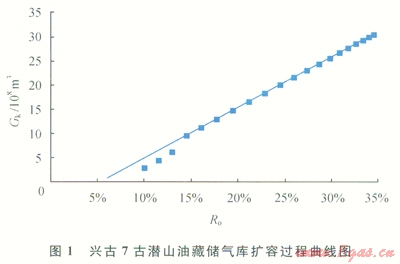 根據(jù)上述方法,計(jì)算了興古7古潛山油藏在氣驅(qū)開發(fā)過(guò)程中,油層中部深度地層壓力保持在27.25MPa下的原油不同采出程度(Ro)時(shí)所對(duì)應(yīng)的地下儲(chǔ)氣庫(kù)庫(kù)容量,當(dāng)油藏達(dá)到最終采收率為34.48%、地層壓力為30MPa時(shí),地下儲(chǔ)氣庫(kù)的庫(kù)容量為30.52×108m3(圖1)。