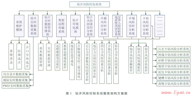 通過(guò)調(diào)研國(guó)內(nèi)外研究現(xiàn)狀,結(jié)合國(guó)內(nèi)生產(chǎn)需要,提出了一套鉆井風(fēng)險(xiǎn)控制系統(tǒng)的整體架構(gòu)方案,如圖1所示。系統(tǒng)主要包括系統(tǒng)維護(hù)模塊、實(shí)時(shí)數(shù)據(jù)采集子系統(tǒng)、實(shí)時(shí)數(shù)據(jù)庫(kù)管理子系統(tǒng)、實(shí)時(shí)數(shù)據(jù)遠(yuǎn)程傳輸子系統(tǒng)、鉆井可視化模塊、鉆井風(fēng)險(xiǎn)因素實(shí)時(shí)分析子系統(tǒng)、不同井下復(fù)雜類型實(shí)時(shí)分析子系統(tǒng)等。實(shí)時(shí)數(shù)據(jù)采集子系統(tǒng)在井場(chǎng)采集錄井儀和隨鉆工具等儀器測(cè)量的鉆井實(shí)時(shí)參數(shù),并存儲(chǔ)到數(shù)據(jù)庫(kù)中,供鉆井風(fēng)險(xiǎn)控制軟件系統(tǒng)調(diào)用、瀏覽、分析各項(xiàng)參數(shù)變化,并診斷、預(yù)測(cè)各種井下復(fù)雜情況,達(dá)到鉆井風(fēng)險(xiǎn)控制的目的。鉆井風(fēng)險(xiǎn)控制系統(tǒng)預(yù)期應(yīng)實(shí)現(xiàn)的功能包括: