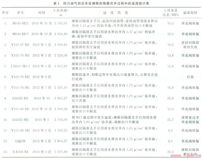 統(tǒng)計(jì)川渝地區(qū)近年在裸眼封隔器完井作業(yè)時(shí)共發(fā)生溢流有14井次(表1)。表中反映了溢流多發(fā)牛在采用KC1完井液替換裸眼段鉆井液和坐封管柱丟手后用清水替出井內(nèi)鉆井液2種工況。