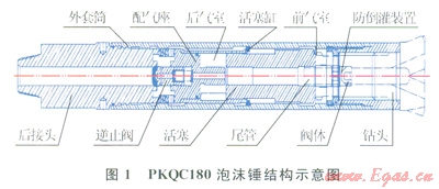和空氣錘[1]類似,研制的泡沫錘采用無(wú)閥式中心排氣結(jié)構(gòu),并增加了防倒灌裝置。主要構(gòu)成部件有:后接頭、外套筒、逆止閥、配氣座、活塞、活塞缸、尾管、防倒灌裝置、鉆頭(圖1)。