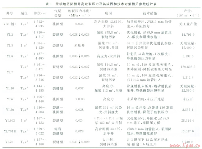 1)元壩地區(qū)處于強(qiáng)構(gòu)造應(yīng)力作用的應(yīng)力場環(huán)境中,儲(chǔ)層三軸應(yīng)力大,破裂壓力普遍偏高;儲(chǔ)層局部高含黏土礦物的泥質(zhì)含量,巖石可塑性增加,抗應(yīng)變能力增強(qiáng),使巖石破裂壓力增高;有的井屬斜井或水平井,井筒與垂向應(yīng)力方向不平行,裂縫起裂壓力增加,使得地層破裂壓力增加;很多井目的層天然裂縫發(fā)育,鉆井過程中鉆井液漏失量大,儲(chǔ)層污染嚴(yán)重,巖石泊松比增加,抗破裂能力增強(qiáng),巖石破裂力顯著增加。這些多因素的影響結(jié)果,導(dǎo)致了元壩地區(qū)陸相儲(chǔ)層巖石破裂壓力普遍在0.026~0.037MPa/m范圍。