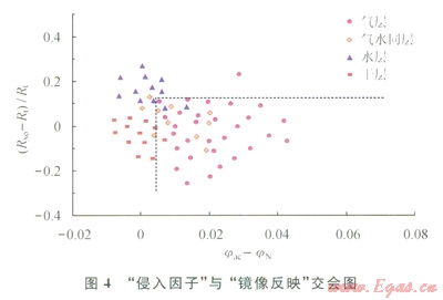 結(jié)合基于淡水鉆井液侵入特征分析以及聲波孔隙度和中子孔隙度的“鏡像反映”特征。通過引入“侵入因子”[(Rxo-Rt)/Rt],其中Rxo、Rt分別為中、深感應(yīng)測井值,建立“侵入因子”與“鏡像反映”(jac-jN)的交會圖,可以有效地識別氣水層(圖4)。