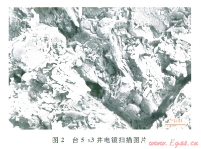 黏土礦物中以蒙脫石、伊蒙混層礦物以及伊利石的附加導(dǎo)電作用最為顯著,當(dāng)吸附陽離子的數(shù)量(即巖石表面的陽離子交換容量)較大時,吸附陽離子的附加導(dǎo)電作用非常顯著,可以使氣層電阻率明顯降低,甚至形成低阻氣層[7-10]。根據(jù)掃描電鏡資料(圖2),臺南氣田儲層中可分別識別出蒙脫石、伊一蒙混層、伊利石、高嶺石、綠泥石以及少量綠蒙混層等自生黏土礦物,它們分布于粒表或粒間。通過統(tǒng)計臺5-x3、臺6-x8、臺試x5等3口井各層位的黏土礦物相對含最發(fā)現(xiàn),臺6-x8蒙皂石平均含量11.9%,伊利石43%,臺試x5和臺5-x3井不含蒙皂石,但伊利石和伊/蒙混層均比較高,臺試x5井伊/蒙混層含量高達(dá)43.8%,伊/蒙混層和伊利石平均含量在54%以上,可能存在黏土附加導(dǎo)電作用。