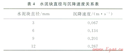 要返出地面液體的上升速度為固體沉降速度的2倍及以上,固體物質(zhì)才能被順利的帶出地面,達(dá)到洗井的效果。根據(jù)力學(xué)分析及水動力學(xué)分析,可以得到固體在液相中的重力沉降速度,密度為3.0~3.15g/cm3硅酸鹽水泥在密度為1.3g/cm3的鉆井液,可計算得沉降速度詳見表4。