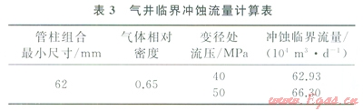 根據(jù)“氣井生產(chǎn)系統(tǒng)分析”系統(tǒng)的分析,完井油管采用Æ89mm或Æ89mm+Æ73mm的復(fù)合油管能夠滿足攜液、抗沖蝕及增產(chǎn)要求(表2、3)。