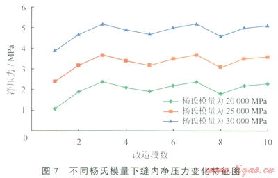 為進(jìn)一步研究?jī)?chǔ)層巖石力學(xué)參數(shù)對(duì)應(yīng)力陰影的影響,設(shè)置不同泊松比和楊氏模量進(jìn)行研究。考察泊松0.2、0.35、0.45比時(shí),結(jié)果表明泊松比對(duì)應(yīng)力陰影的影響較小,即便在泊松比為0.5的極端情況下,導(dǎo)致的凈壓力變化幅度仍不大,因此產(chǎn)生的應(yīng)力影響很小(圖6)??疾鞐钍夏A?span lang="EN-US">20000MPa、25000MPa、30000MPa等3種情況,研究表明:楊氏模量對(duì)裂縫內(nèi)凈壓力值的變化影響較大,產(chǎn)生的應(yīng)力陰影現(xiàn)象越強(qiáng)烈,楊氏模量越高對(duì)裂縫應(yīng)力陰影效果影響也較大(圖7)。因此,儲(chǔ)層巖石力學(xué)參數(shù)中楊氏模量對(duì)應(yīng)力陰影現(xiàn)象的影響最敏感。