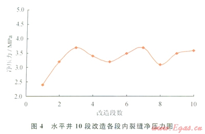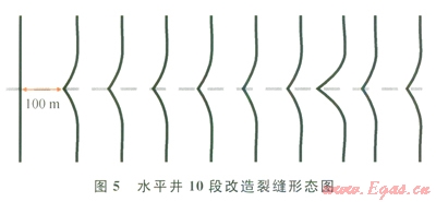 以某口致密儲(chǔ)層X水平井為例,水平段長(zhǎng)度1043m,儲(chǔ)層有效孔隙度8%,有效滲透率0.12mD,地層孔隙壓力29.0MPa,楊氏模量25000MPa,泊松比0.2,最小水平主應(yīng)力43.2 MPa,抗張強(qiáng)度3.5MPa。分段改造設(shè)計(jì)6~10段。利用上述數(shù)學(xué)模型計(jì)算水平井10段改造下不同段內(nèi)的凈壓力及裂縫形態(tài)表明:100m的段間距內(nèi)裂縫將發(fā)牛轉(zhuǎn)向(圖4、5)。