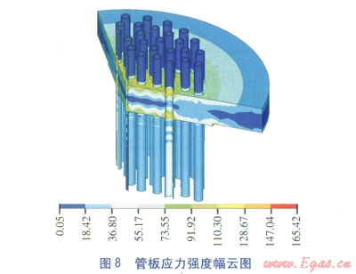 管板承受最高工作壓力為5.5MPa、最低工作壓力為0.0MPa,根據(jù)式(2)~(5),計(jì)算出在最高工作壓力pin=5.5MPa時(shí)管板承受各項(xiàng)載荷數(shù)據(jù),見表4。通過(guò)軟件計(jì)算,得到應(yīng)力強(qiáng)度幅云圖,見圖8,圖中數(shù)值為應(yīng)力強(qiáng)度幅,單位為MPa。