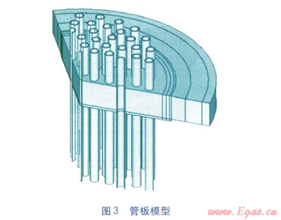 因此,建模時(shí)在理論上換熱管在管板兩側(cè)需要保留的外伸長(zhǎng)度應(yīng)大于9.7mm,即可滿足要求。根據(jù)工程實(shí)際情況,該模型取換熱管相對(duì)于管板向上外伸長(zhǎng)度為140mm,向下外伸長(zhǎng)度為300mm(實(shí)際加熱器換熱管相對(duì)于管板向上外伸長(zhǎng)度為160mm,向下外伸長(zhǎng)度為2400mm)。