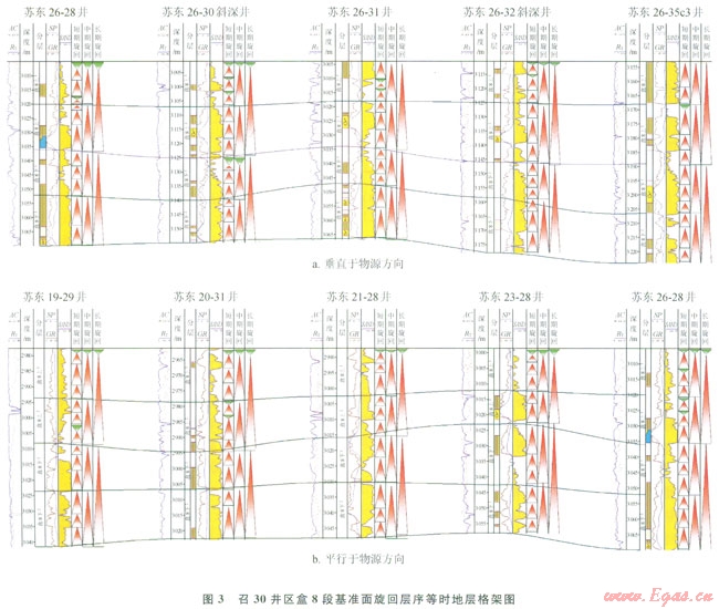 蘇里格地區(qū)盒8段砂體構型可分為復合河道砂體和單一河道砂體,前者被稱為疊置河道砂,后者被稱為單河道砂。本文以層序地層學理論為依據(jù),在層序地層界面識別的基礎上,建立了召30井區(qū)盒8段高分辨率層序地層格架,通過中期基準面的對比識別出疊置河道砂,進而通過短期基準面的對比識別出單河道砂,并定量刻畫該地區(qū)盒8段河道帶及河道砂體規(guī)模,建立儲集砂體構型,以期為氣田開發(fā)過程中的井距優(yōu)化和天然氣“甜點”的選擇提供依據(jù),提高氣田開發(fā)效益。