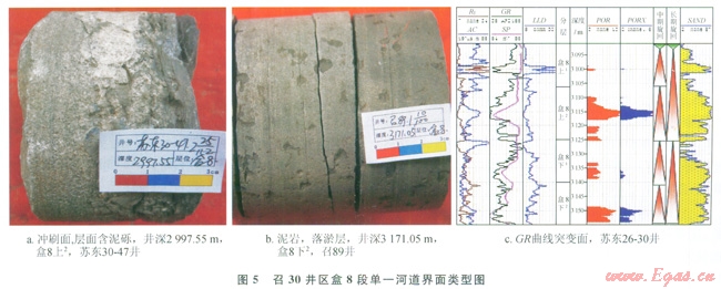 單一河道是指較長周期的大洪水期形成的具有一定分布范圍的河道單元,其識別的意義在于復合河道內垂向上的單一河道單元的劃分,每一期次洪水的流量、流速不盡相同。因此可以依據(jù)河道內的泥質層、細粒沉積的發(fā)育位置、沖刷面以及測井曲線的突變來對其進行識別[20]。區(qū)內單一河道的界面表現(xiàn)為(圖5):①沖刷面,代表洪水對前期沉積物的改造,多含泥礫;②泥巖及粉砂巖沉積,代表憩水期水體能量相對較弱時的細粒沉積,保存程度視后一期洪水能量的強弱而定;③測井曲線(GR)突變面。通過以上3種界面對召30井區(qū)盒8段短期基準面旋回內單一河道進行識別,每個短期旋回內均發(fā)育2~3期單一河道沉積。
