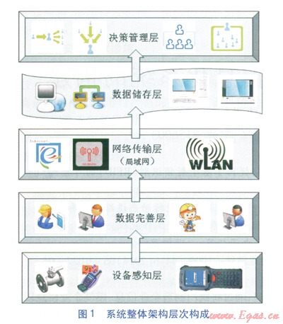 RFID可控閥門信息化系統(tǒng)整體架構(gòu)由設(shè)備感知層、數(shù)據(jù)完善層、網(wǎng)絡(luò)傳輸層、數(shù)據(jù)儲存層、決策管理層共5個層次構(gòu)成,系統(tǒng)整體架構(gòu)層次構(gòu)成見圖1。