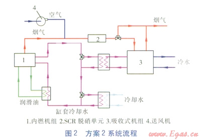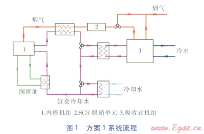 方案1系統(tǒng)流程見圖1。內(nèi)燃機(jī)組煙氣經(jīng)煙氣—水換熱器后進(jìn)入SCR脫硝單元,脫硝后進(jìn)入煙氣熱水型溴化鋰吸收式冷水機(jī)組(以下簡(jiǎn)稱吸收式機(jī)組),放熱后與過剩煙氣一同排放。缸套冷卻水分別經(jīng)兩級(jí)換熱器降溫后,再吸收潤(rùn)滑油部分熱量,最終回到內(nèi)燃機(jī)組缸套。