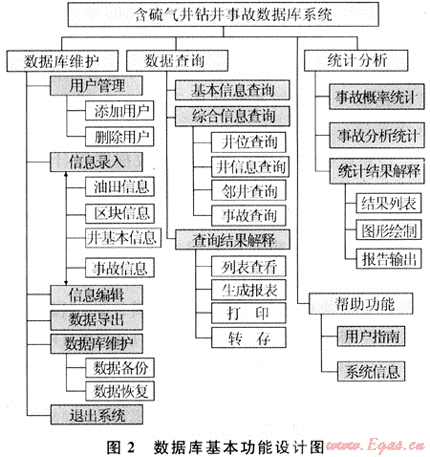 利用現(xiàn)場收集、文獻調(diào)研、報刊和情報調(diào)研的方式收集川東北地區(qū)68口井的資料和517起鉆井事故資料。把所搜集到的海量數(shù)據(jù)轉(zhuǎn)化成計算機可識別的文件,以數(shù)據(jù)庫文件的形式存儲于數(shù)據(jù)庫系統(tǒng)。含硫氣井鉆井事故數(shù)據(jù)庫系統(tǒng)主要有如下應(yīng)用: