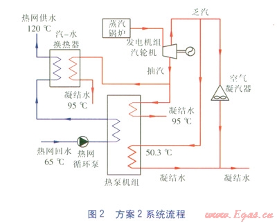 發(fā)電機(jī)組汽輪機(jī)抽汽作為熱泵機(jī)組驅(qū)動(dòng)蒸汽,低溫?zé)嵩礊樾∑啓C(jī)凝汽器冷卻水余熱。方案1的系統(tǒng)流程見圖1。系統(tǒng)流程可分為3個(gè)分項(xiàng)流程:a.熱網(wǎng)循環(huán)水流程:熱網(wǎng)回水65℃,經(jīng)熱泵機(jī)組加熱至88℃后,進(jìn)入汽—水換熱器加熱至l20℃作為熱網(wǎng)供水。b.發(fā)電機(jī)組汽輪機(jī)抽汽流程:不考慮小汽輪機(jī)用汽,發(fā)電機(jī)組汽輪機(jī)抽汽分為兩部分,一部分作為熱泵機(jī)組驅(qū)動(dòng)蒸汽,另一部分進(jìn)入汽—水換熱器加熱熱網(wǎng)回水,兩部分凝結(jié)水溫度均為95℃,并由汽動(dòng)給水泵加壓輸送回蒸汽鍋爐。c.凝汽器冷卻水流程:小汽輪機(jī)凝汽器出口冷卻水溫度為51℃,作為熱泵機(jī)組低溫?zé)嵩?,余熱利用后溫度降?span lang="EN-US">42.7℃,經(jīng)冷卻塔進(jìn)一步降溫后(冷卻塔出水溫度為37.5℃)進(jìn)入凝汽器。