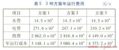 3種方案年運(yùn)行費(fèi)用見表5。水價(jià)按2元/t計(jì)算,電價(jià)按0.3707元/(kW·h)計(jì)算,蒸汽熱價(jià)按18元/GJ計(jì)算。由表3可知,方案1的系統(tǒng)造價(jià)最高,其次為方案2,方案3的系統(tǒng)造價(jià)最低。由表5可知,方案2的年運(yùn)行費(fèi)用最低,其次為方案1,方案3的年運(yùn)行費(fèi)用最高。將方案3作為對(duì)比方案,方案1、2高出的系統(tǒng)造價(jià),分別在2.8、2.4a時(shí)可以收回??紤]年運(yùn)行費(fèi)用,方案1、2的整體經(jīng)濟(jì)性優(yōu)于方案3,且方案1、2的差距不大。