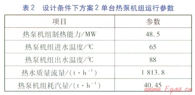 由于熱泵機(jī)組低溫?zé)嵩礊榉ζ瑹岜脵C(jī)房宜設(shè)置在空冷島附近,且機(jī)房占地面積不宜過大,選擇2臺(tái)制熱能力為48.5MW的熱泵機(jī)組,3臺(tái)換熱能力為45MW的汽—水換熱器。方案2的運(yùn)行策略與方案1一致,設(shè)計(jì)條件下(室外溫度為-22℃),方案2單臺(tái)熱泵機(jī)組運(yùn)行參數(shù)見表2。