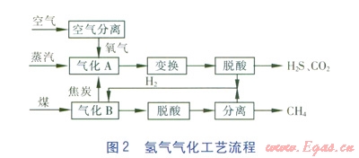 直接轉(zhuǎn)化方法主要有氫氣氣化、水蒸氣催化氣化方法。氫氣氣化方法以氫氣作為氣化劑,氫氣由焦炭—蒸汽—氧氣氣化制得(對應(yīng)氣化器A一路),煤氫氣氣化后(對應(yīng)氣化器B一路)經(jīng)脫酸得到的產(chǎn)物主要為甲烷、氫氣(過剩部分),經(jīng)分離最終得到甲烷,過剩氫氣與來自氣化器A一路的氫氣一起返回氣化器B作為煤氣化劑。氫氣氣化工藝流程見圖2。目前,l3本新能源產(chǎn)業(yè)技術(shù)綜合開發(fā)機構(gòu)(NEDO)正大力發(fā)展該項技術(shù),據(jù)報道氫氣氣化技術(shù)的熱效率比間接轉(zhuǎn)化方法高,造價也有望降低,從而進一步提高SNG的競爭力[2]。