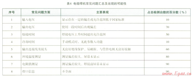 表4匯總了檢測(cè)過(guò)程中發(fā)現(xiàn)的常見(jiàn)問(wèn)題以及占總檢測(cè)臺(tái)數(shù)的百分?jǐn)?shù)。其中常見(jiàn)的直接影響焊接質(zhì)量的問(wèn)題主要是輸出電壓和環(huán)境溫度測(cè)量,而電阻值測(cè)量與焊口信息兩方面是電熔焊機(jī)普遍存在的問(wèn)題。這應(yīng)引起焊機(jī)廠家與焊接質(zhì)量管理部門(mén)的重視。