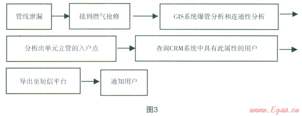 在GIS系統(tǒng)中,設(shè)置單元立管的入戶點為最小單元;在CRM系統(tǒng)中,增加燃氣用戶所屬單元立管入戶點的屬性;當出現(xiàn)燃氣管道泄漏搶修問題時,可以通過GIS系統(tǒng)中的爆管分析和連通性分析,分析出泄漏點所影響的單元立管入戶點,通過調(diào)用CRM系統(tǒng)中的具有此入戶點屬性的用戶,分析出所影響的用戶數(shù),并調(diào)用短信平臺接口將停氣通知實時發(fā)送至用戶手機中。此種方式,提高了影響范圍用戶的準確性,并縮短了通知用戶的時間。具體的過程如圖3。