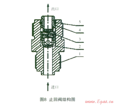 止回閥由閥體①、錐閥芯②、彈簧③、彈簧座③和擋圈⑤構(gòu)成(見圖8)。其工作原理是壓縮氣體進入閥體,克服彈簧的彈簧力和摩擦力使止回閥開啟,壓縮氣體從進口流入從出口流出,當出口無壓縮氣體時,在彈簧力和進口(腔)余力作用下,閥口處于關閉狀態(tài),使從進口到出口的氣體不流通。適用于只允許氣體向一個方向流動,即從進口流入從出口流出,反過來則不可以。