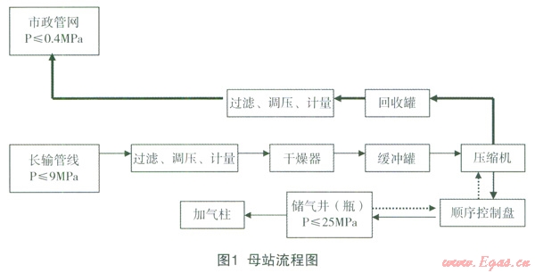 母站接收的天然氣,經(jīng)過加工,一部分加注燃氣車輛,一部分進入市政管網(wǎng),形成了兩個供氣路徑。其中,儲氣井的氣可以通過順序控制盤、壓縮機,經(jīng)過過濾、調(diào)壓、計量,進入市政管網(wǎng)(見圖l)。