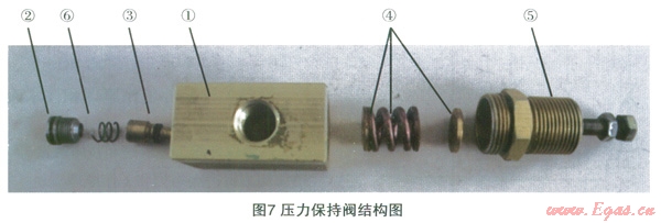 壓力保持閥由閥體(進出口)①、閥芯組件②③、彈簧組件④和調(diào)壓閥體⑤構(gòu)成,用于保持壓縮機在不低于一定壓力的情況下工作的重要部件。其工作原理是氣體從|礙體進口流入,經(jīng)過閥芯,通過壓力推動閥芯,克服彈簧組件的彈簧力和摩擦力,擠壓彈簧,使氣體從閥芯和彈簧組件密封的閥體中流出。調(diào)節(jié)閥體則是用于調(diào)節(jié)壓力保持閥額定壓力的元件,即調(diào)節(jié)彈簧組件的松緊度(見圖7)。