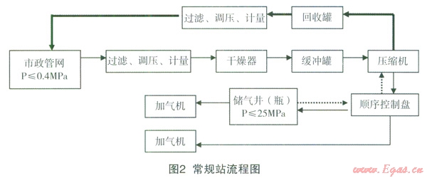 接通市政管網(wǎng)是常規(guī)加氣站一個顯著的特征。儲氣井(瓶)中的天然氣回收從儲氣井(瓶)開始,流經(jīng)順序控制盤、壓縮機到回收罐,最后經(jīng)過過濾、調(diào)壓、計量進入市政管網(wǎng),形成了一個供氣回路(見圖2)。