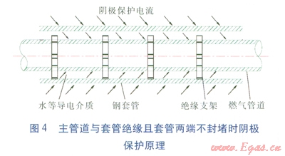 ③不可避免加設(shè)套管時,套管兩端可不必密封防水材料,只要在主管道與套管之間充填柔軟材料防止沙石進(jìn)入對防腐層起破壞作用即可。因為當(dāng)套管內(nèi)有水或泥土存在時,能起到導(dǎo)電介質(zhì)的作用,陰極保護電流通過介質(zhì)形成回路,不會被屏蔽。套管可視為土壤介質(zhì)的一部分,陰極保護電流從套管外壁流入,從套管內(nèi)壁流出,再從主管道外部流入,主管道將受到很好的陰極保護[2]。如果套管與主管道間有特定性能的電解質(zhì)物質(zhì),導(dǎo)電性能會更好,主管道陰極保護的效果會更好,其原理見圖4。