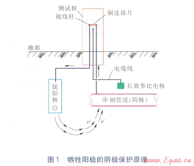 陰極保護分犧牲陽極陰極保護法和外加電流陰極保護法。綠博公司主管道采用的是犧牲陽極陰極保護法,其原理就是原電池的原理,是將一種比鐵更活潑的鎂陽極與被保護的鋼管相連接,通過鎂陽極的不斷氧化反應(yīng),向被保護的鋼管提供保護電子,使其獲得保護。犧牲陽極陰極保護原理見圖l。