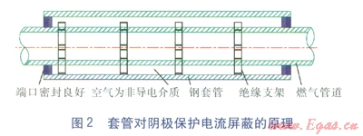 穿越公路、鐵路的燃?xì)夤艿腊凑赵O(shè)計要求,施工時要加設(shè)套管,并且套管與主管之間要用絕緣的支架支撐,套管兩端用柔性的防水材料封堵,防止地下水進(jìn)入套管內(nèi)使主管道發(fā)生腐蝕。在對管道防腐情況的檢測中我們發(fā)現(xiàn),嚴(yán)格按照規(guī)范要求施工的管道,并不能阻止管道腐蝕的發(fā)生,并且越是加設(shè)套管的地方,主管道發(fā)生腐蝕的情況越嚴(yán)重。為了查明原因,根據(jù)檢測情況,我們有針對性地挖出幾處腐蝕嚴(yán)重的地方,通過查閱相關(guān)資料,并聘請專家現(xiàn)場實地踏勘、分析,終于弄清了問題的癥結(jié)。套管內(nèi)主管道能夠得到有效陰極保護的必要條件是主管道與套管之間存在導(dǎo)電介質(zhì),而我們嚴(yán)格按照規(guī)范施工的管道,套管與主管道之間設(shè)絕緣支架,套管兩端防水密封良好,套管與主管道之間的介質(zhì)是空氣,然而正是由于兩端密封好,地下水不能進(jìn)入,空氣也不能導(dǎo)電,導(dǎo)致沒有導(dǎo)電介質(zhì)。主管道雖然加設(shè)陰極保護,但陰極保護電流受空氣層阻斷被完全屏蔽,不能起到任何作用,這就是套管對陰極保護電流產(chǎn)生了屏蔽[2]。另外,主管道在穿越套管施工時,人工拖、拽等操作經(jīng)常破壞主管道的防腐層,如果我們沒有及時發(fā)現(xiàn)并修補防腐層,管道埋地投用后,主管道雖然加設(shè)了陰極保護裝置,但因為套管對陰極保護電流的屏蔽,陰極保護不起作用,這樣套管內(nèi)主管道的破損處會處于自然氧化、腐蝕的狀態(tài),進(jìn)而腐蝕會逐步蔓延,這就是越加設(shè)套管的地方,主管道腐蝕越嚴(yán)重的原因。套管對陰極保護電流屏蔽的原理見圖2。