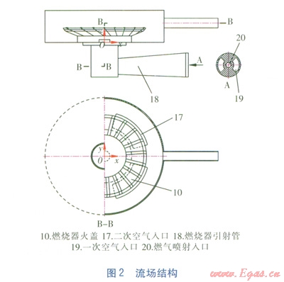 伴隨著人們生活水平的提高和國家能源結(jié)構(gòu)的調(diào)整,高效、環(huán)保、節(jié)能型烹飪灶具逐漸成為市場的寵兒[1-2]。內(nèi)燃灶就是在這樣的背景下提出來的。從基于第一代樣機(jī)所做的原理驗(yàn)證性試驗(yàn)來看,內(nèi)燃灶的工作原理基本可行[3]。然而,通過試驗(yàn)數(shù)據(jù)計(jì)算得到的熱效率值與理論值之間有較大偏差;同時,樣機(jī)的高效率區(qū)所對應(yīng)的燃?xì)忾y開度偏離了家用燃?xì)庠畹某S霉ぷ鲄^(qū)。因此必須對樣機(jī)結(jié)構(gòu)進(jìn)行改進(jìn)。明確燃?xì)夂涂諝庠跔t腔內(nèi)的流動狀態(tài),對于發(fā)現(xiàn)樣機(jī)設(shè)計(jì)上存在的問題和改進(jìn)樣機(jī)結(jié)構(gòu)具有重要的指導(dǎo)意義。