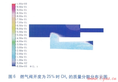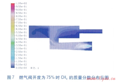 圖6、7為沿爐腔排氣導(dǎo)管軸線縱截面(即y=0平面)內(nèi)CH4的質(zhì)量分?jǐn)?shù)分布云圖,單位為l。當(dāng)燃?xì)忾y開度為25%時,燃?xì)鈬娚渌俣容^低,引射管內(nèi)CH4的質(zhì)量分?jǐn)?shù)較大,說明燃?xì)獾靡栽谝涔軆?nèi)和空氣預(yù)混充分,然后進(jìn)入爐腔內(nèi)點(diǎn)火燃燒。當(dāng)燃?xì)忾y開度為75%時,燃?xì)鈬娚渌俣容^高,引射管內(nèi)CH4的質(zhì)量分?jǐn)?shù)比燃?xì)忾y開度為25%狀態(tài)低了很多。