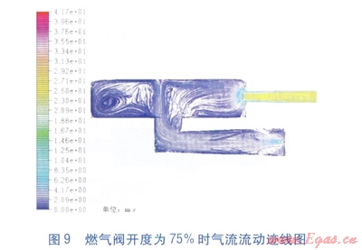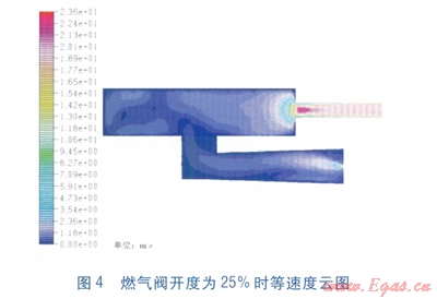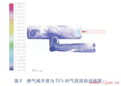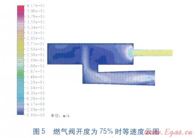 利用FLUENT軟件對比模擬了燃?xì)忾y開度為25%和75%兩種條件下爐腔內(nèi)的氣體流動狀態(tài)。計(jì)算得出兩種狀態(tài)下整個爐腔內(nèi)氣流的最高流速分別為24.61m/s和46.86m/s。高速流主要出現(xiàn)在爐腔排氣導(dǎo)管。