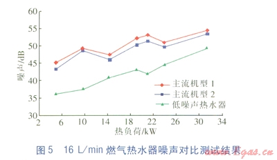 由圖5可知,當(dāng)熱負(fù)荷在24kW以下時,l6L/min的低噪聲熱水器的噪聲比主流機(jī)型低10dB以上;最大熱負(fù)荷時,低4dB以上。