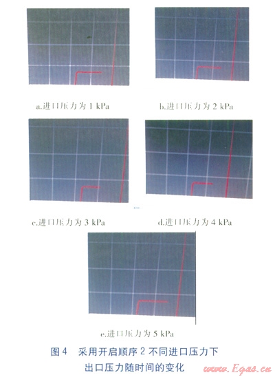 在不同進氣壓力p1(1、2、3、4、5kPa)下進行試驗,并記錄出口壓力p2的變化情況,見圖4,橫坐標表示時間,縱坐標表示p2。由圖4可知,采用開啟順序2時,出口壓力p2比較穩(wěn)定,隨著進口壓力p1升高,出口壓力p2仍然比較穩(wěn)定,沒有出現(xiàn)過沖現(xiàn)象。