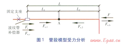 本文分析對象為一側(cè)活動端為補償彎頭,另一側(cè)活動端為波紋管補償器的直埋水平轉(zhuǎn)角管段,設(shè)定管段中存在不發(fā)生位移的點A,管段模型受力分析見圖1。