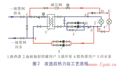熱力站一級側(cè)供、回水溫度為100、60℃,改造前熱力站二級側(cè)(僅有地板輻射供暖用戶)供、回水溫度為50、40℃,擬增加的散熱器用戶供回水溫度為80、60℃。改造前后熱力站工藝流程分別見圖1、2。由圖1、2可知,改造后,散熱器用戶一部分供水由換熱器二級側(cè)供水管道引出,另一部分供水由換熱器一級側(cè)供水管道引出。由一級側(cè)供水管道引出的熱水經(jīng)減壓閥、電動調(diào)節(jié)閥后,與由二級側(cè)供水管道引出的熱水混合,作為散熱器用戶的供水。散熱器用戶回水與地板輻射供暖用戶回水混合后,一部分回到換熱器二級側(cè)回水管道,另一部分回到一級側(cè)回水管道。改造后二級側(cè)補(bǔ)水可由一級側(cè)補(bǔ)充,因此二級側(cè)原有補(bǔ)水裝置(補(bǔ)水泵、水處理裝置等)可取消?;厮昧髁颗c管道CD流量一致。經(jīng)校核,新增散熱器用戶的流量未超出循環(huán)泵的裕量,不影響地板輻射用戶流量。
