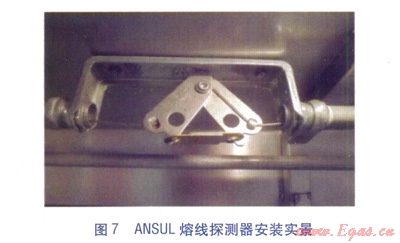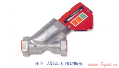 ⑥機(jī)械切斷閥(見圖9)。安裝于廚房燃?xì)饪傞y下游燃?xì)夤艿郎?,?dāng)ANSUL系統(tǒng)啟動時,機(jī)械切斷閥由鋼絲繩索控制而關(guān)閉,切斷廚房燃?xì)夤?yīng),經(jīng)手動復(fù)位。