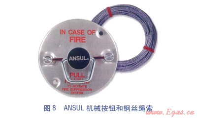 ⑤機(jī)械按鈕(見圖8)。是手動啟動滅火系統(tǒng)的操作工具,通過鋼絲繩索管連接到釋放裝置。機(jī)械按鈕拉環(huán)設(shè)計成允許三個手指操作,并有紅色字樣標(biāo)志,方便快速辨認(rèn)。
