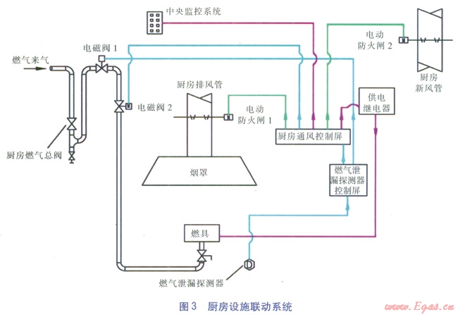 由于在商業(yè)廚房內(nèi)安裝燃?xì)庠O(shè)施種類及數(shù)量較多,需要防止燃?xì)庑孤?,同時在廚房火災(zāi)發(fā)生時,若有燃?xì)庵紕t火災(zāi)更加難以控制,造成的災(zāi)難更大。基于安全準(zhǔn)則,工程實踐中,通常在商業(yè)廚房的燃?xì)饪傞y的下游設(shè)置一組電磁閥,與燃?xì)庑孤┨綔y器、廚房通風(fēng)管道內(nèi)的電動防火閘、供電繼電器聯(lián)動。當(dāng)燃?xì)庑孤┨綔y器偵測到泄漏發(fā)生時,發(fā)出報警,電磁閥關(guān)閉、電動防火閘關(guān)閉、供電繼電器切斷廚房燃具電源。由上述設(shè)備組成的廚房聯(lián)動系統(tǒng)同時切斷了可燃物燃?xì)狻⒅嘉锟諝獾墓?yīng)以及消除可能存在的點火源。電動防火閘的關(guān)閉則更是可以遏制火災(zāi)經(jīng)通風(fēng)管道向其他地方蔓延。廚房設(shè)施聯(lián)動系統(tǒng)見圖3。