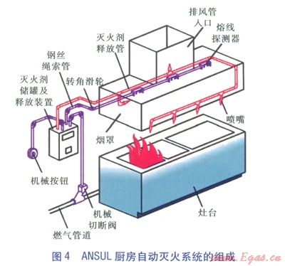 ANSUL廚房自動滅火系統(tǒng)的工作原理如下:廚房著火導(dǎo)致布在廚房保護(hù)區(qū)(即灶臺、煙罩及其排風(fēng)管入口附近等火災(zāi)危險區(qū))的探測器熔線斷開,引發(fā)連接在探測器上的鋼絲繩索松開,滅火劑釋放裝置啟動,打開動力氣筒,釋放出高壓氣體進(jìn)入滅火劑儲罐,把滅火劑壓出并通過釋放管道輸送至噴嘴噴向保護(hù)區(qū),同時釋放裝置控制鋼絲繩索關(guān)閉機(jī)械切斷閥。ANSUL廚房自動滅火系統(tǒng)的組成見圖4。