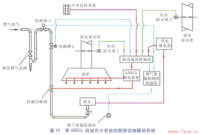 對于基于燃?xì)庑孤┨綔y的聯(lián)動的缺陷,我們不敢掉以輕心,經(jīng)過與設(shè)計團(tuán)隊中消防工程師進(jìn)行深入的探討,以及咨詢?nèi)季邚S商的專業(yè)意見,針對商業(yè)廚房的特性,在進(jìn)一步的工程實踐中,在廚房增設(shè)ANSUL自動滅火系統(tǒng),燃?xì)夤?yīng)系統(tǒng)與之聯(lián)動,而不僅僅是設(shè)置電磁閥與燃?xì)庑孤┨綔y器。