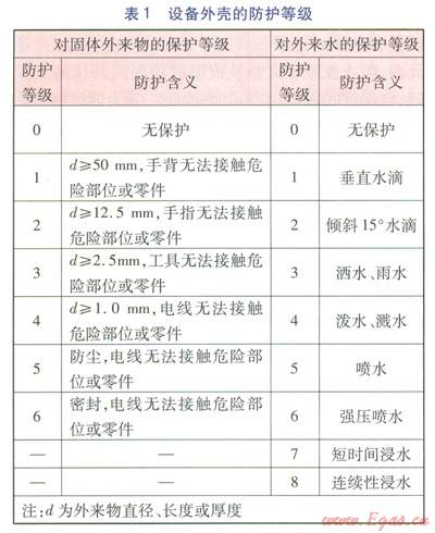 國際防護(hù)符號IP,即Ingress Protection Rating(防護(hù)等級),或International Protection Rating(國際保護(hù)等級),表示裝置外殼的防護(hù)等級,由IP和后續(xù)的兩位數(shù)字組成。第一個數(shù)字為0~6,表示對固體外來物的保護(hù)等級,第二個數(shù)字為0~8,表示對外來水的保護(hù)等級,數(shù)字越大表示防護(hù)等級越高。國際電工技術(shù)委員會(International Eleetroteehnical Commission,IEC)標(biāo)準(zhǔn)IEC 529《外殼所提供的保護(hù)等級》(Degrees of Protection Provided by Enclosure)的相關(guān)規(guī)定見表1。